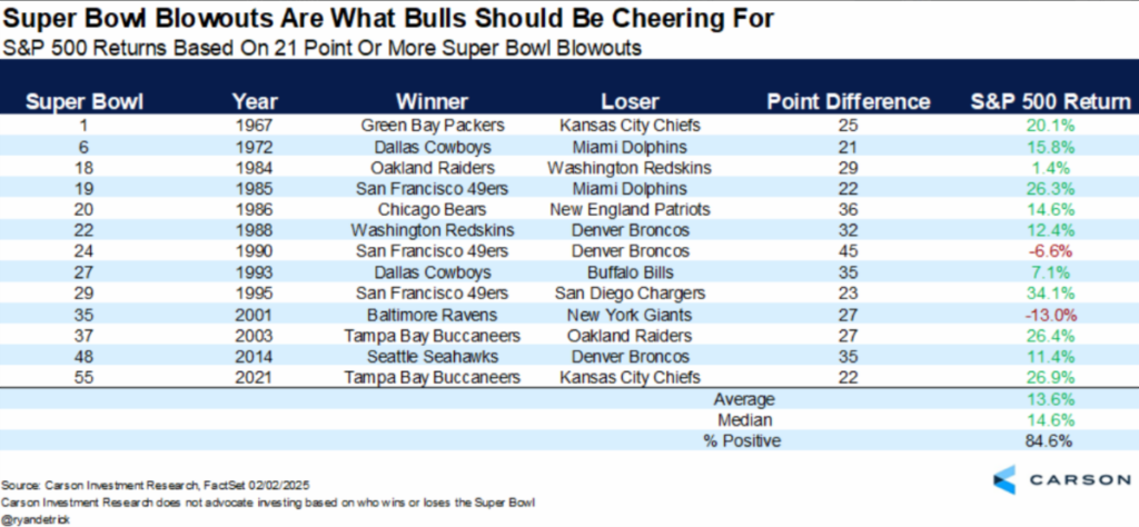 BUT, I was later relieved to see that blow out wins in Super Bowls tend to be quite bullish! So, maybe we are still in good shape?